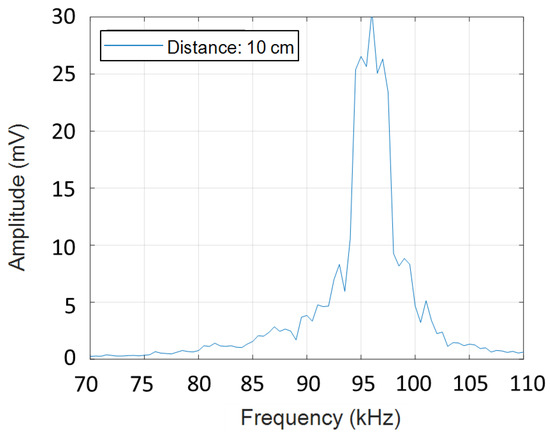 The ultrasonic microphone in the system is a commercial Knowles analogue silicon MEMS microphone, SPH0642HT5H-1, with an acoustic sensor, a low noise input buffer and an output amplifier. The microphone is stated to have a flat frequency response from 100 Hz to 10 kHz. We tested that the microphone operates out of range in the ultrasound frequency range. The SINTEF PMUT loudspeaker was used to send a frequency sweep from 70 to 110 kHz, and around the resonance frequency of the loudspeaker (90–100 kHz) the receiver microphone signal was found to have sufficient quality to be used in the present experiments. Figure 2 shows the frequency response of the microphone resulting from the frequency sweep transmitted by the SINTEF PMUT loudspeaker.