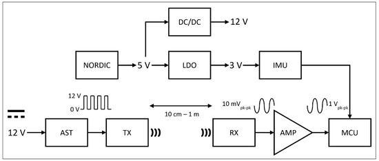 Transmitter and receiver electronics boards functional building blocks supported by text description: NORDIC: Nordic Semiconductor development board. DC/DC: charge pump. LDO: low dropout regulator. IMU: inertial measurement unit. AST: astable multivibrator pulse generator. TX: ultrasonic loudspeaker (transmitter board only). RX: ultrasonic receiver (microphone board only). AMP: amplifier circuit. MCU: microcontroller.