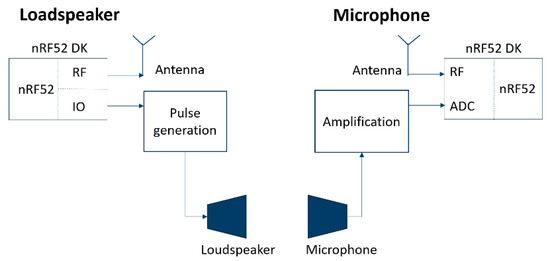 An nRF52 development kit from Nordic Semiconductor was used as a basis module as it contains a radio with an embedded microcontroller. The software may be configured to accommodate different radio protocols such as Bluetooth Low Energy, Thread, ANT, and Enhanced Shock Burst (ESB). The kit also allows easy access to some basic peripherals such as GPIOs and a 14-bit analog-digital converter (ADC). Powering of the board and the other electronic components was carried out using a power bank (MO8735, Mobility on board (MOB), Paris, France). Figure 4 shows a block-schematic representation of the hardware setup.