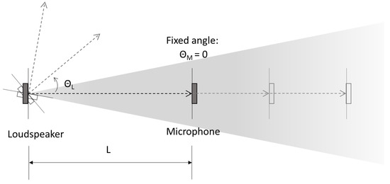 Illustration of the time-of-flight (ToF) sensor characterization setup. L: The distance between the loudspeaker and the microphone. : loudspeaker angle to the central line between the loudspeaker and the microphone. : microphone angle to the central line between the loudspeaker and the microphone.
