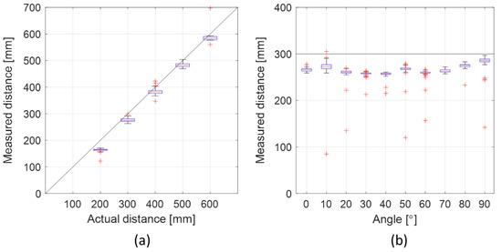The ToF sensor lobe had a range of up to 60 cm at the current measurement configuration. The lobe width was wide with sufficiently strong signals for ToF measurements from 0° to 90° between the loudspeaker and the microphone. Figure 6 shows the measured distance for the lobe range (a) and the lobe width (b). The root-mean-square errors (RMSEs) for the different distance measurements in (a) were in the range 2.3–3.3 mm, except for the 600 mm distance measurement which had an RMSE of 6 mm. The average RMSE was 3.4 mm. For the different angles (b), the RMSE for the distance measurements ranged from 1.8 to 5.2 mm with an average of 3.1 mm.