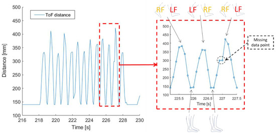 The semicontinuous ToF distance between the lower legs during a 25-foot walk. One full step during the walk is enlarged within the red dashed box visualizing the individual ToF distance measurements marked as blue circles. The relative positions of the feet are indicated above and below the plot for the extreme values of the ToF distance. The dashed circle indicates a missing ToF distance measurement (the value of the previous ToF distance measurement is given instead).