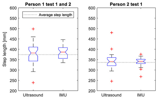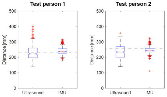 The maximum ToF distance (ultrasound) and estimated GaitUp ® IMU stride length between the lower legs during 5-min treadmill walking by the two test persons presented as boxplots (the red central line indicates the median, the bottom and top blue edges indicate the 25th and 75th percentiles, respectively, the black lines indicate the range of data points not considered outliers, and the red crosses indicate outliers). The GaitUp ® IMU stride length is pooled for both legs. The dotted line shows the average stride length between the lower legs as total walked distance divided by number of steps.