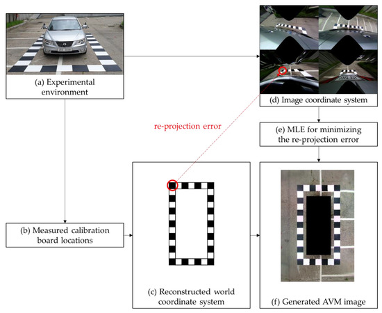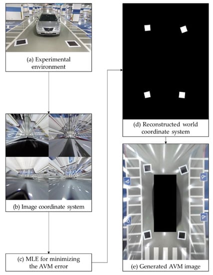 The AVM system transforms four captured images to generate an AVM image, as shown in Figure 1. In AVM calibration, image transformation parameters that are required to generate the AVM images are estimated. These parameters describe the geometrical relationship between the captured image coordinate system and the world coordinate system. In conventional AVM calibration, the maximum likelihood estimation (MLE) is used to estimate this relationship.