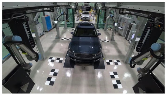 Conventional AVM calibration requires the alignment of the calibration boards for measurements, as shown in Figure 1a. Because calibration boards are spread over a large area, accurately measuring calibration boards is an exhaustive procedure. Vehicle manufacturers use AVM calibration facilities to measure the calibration board locations accurately, as shown in Figure 2 [7]. Various AVM calibration studies are also based on well-aligned calibration boards [8,9,10,11,12,13,14,15,16,17,18,19]. The details of these studies are provided in Section 2.1.
