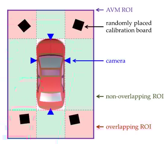 The proposed AVM calibration environment. The region of interest (ROI) of the AVM image (purple rectangle) can be divided into the overlapping ROI (red area) and the nonoverlapping ROI (green area).