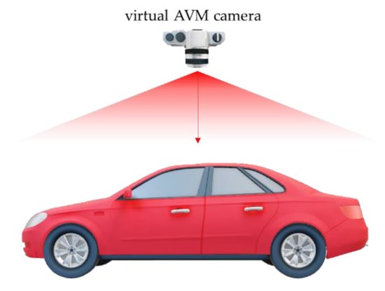 where is the focal length, is a 2 × 2 identity matrix, and is a 2D principal point. We assume that a virtual AVM camera is over the vehicle and looks at the vehicle vertically downward to generate an AVM image, as shown in Figure 5.