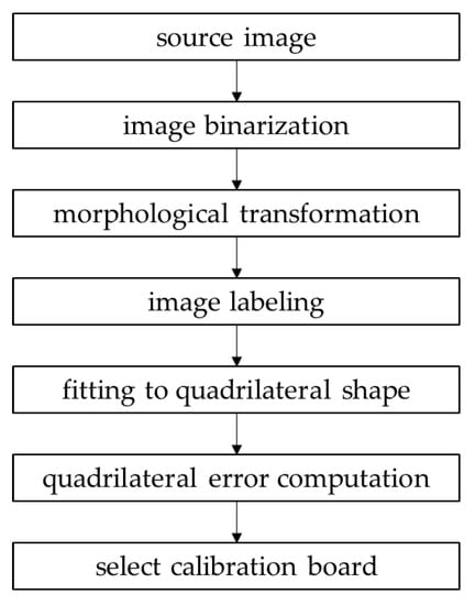 We utilize the adaptive thresholding image binarization method to binarize the source images [31]. This method computes the local threshold values instead of the global threshold value to accurately binarize an image. The morphological transformation can remove noise [32], and the labeling algorithm assigns the pixels to the same group if the values between the neighboring pixels are identical [33]. Next, we detect the edge points of the labeled object and fit the edge points to four straight lines using K-mean clustering [34].
