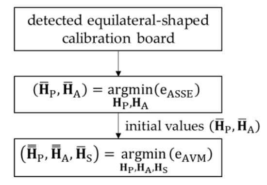 To solve this problem, we find the appropriate initial parameters by minimizing the ASSE. To minimize the ASSE, we utilize the Levenberg–Marquardt algorithm, which is most widely used to solve the maximum likelihood problems of camera calibration. The estimated matrices and , by minimizing the ASSE, are used as initial values to minimize the LSSE–AME combination, as shown in Figure 8. Since the matrices and are already optimized, the local minimum problem caused by the size of the calibration board can be solved. The LSSE–AME combination is also minimized by utilizing the Levenberg–Marquardt algorithm.