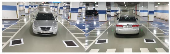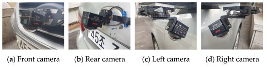 We performed several experiments to evaluate the proposed method. We used Kodak’s PIXPRO SP360 cameras with a 235 field of view and a 2880 2880 resolution [35]. The cameras were installed on a Hyundai SONATA vehicle, as shown in Figure 9 [36]. The installation heights of the front, rear, left, and right cameras are approximately 57, 84, 92, and 92 , respectively. Each camera is tilted approximately 30. The overall length of the vehicle is 480 , the overall width is 183 , and the overall height is 147.5. The dimensions of the calibration boards are 50 50 and we set the calibration board dimensions in the AVM image to 100 100 .
