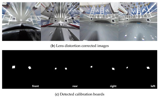 We placed four calibration boards around the vehicle to evaluate the performance of the proposed method, as shown in Figure 10. Because the camera manufacturer provides the lens distortion parameters and intrinsic parameters, we can easily correct the lens distortion, as shown in Figure 11. In the lens distortion-corrected images, the shape of the calibration boards is quadrilateral. The calibration board detection detects two quadrilaterals per image, as shown in Figure 11c. The proposed method transforms the source images such that the detected quadrilateral calibration boards become squares. Figure 12 shows the generated AVM image using the proposed method. We can observe that all the calibration boards are similar to squares and the adjacent images are well aligned. Furthermore, even though there are no calibration boards in the nonoverlapping ROI, the source image in the nonoverlapping ROI can also be transformed into a well-calibrated AVM image.