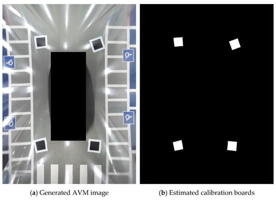 Around view monitoring (AVM) systems eliminate blind spots around the vehicle to prevent car accidents [1]. Because AVM systems create images that show the surrounding view of the vehicle, various vision-based advanced driver assistance systems (ADAS) utilize these AVM-produced images. For example, the parking space detection system detects the parking lines in the AVM images to determine the parking space area [2,3,4], the automated driving system detects the road lanes in the AVM images to track the position of the vehicle [5], and the downward view generation operation transforms an AVM image to generate a downward view image [6]. Therefore, these systems all require well-calibrated AVM images.