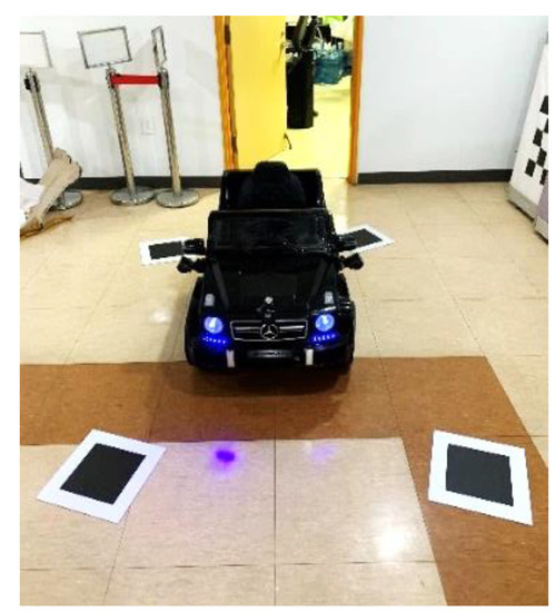 The orientation and location of the camera can change depending on the type and size of a vehicle. Because the proposed method should be able to generate an AVM image regardless of vehicle type, we experimented using an electric vehicle for children to verify this aspect, as shown in Figure 14. The installation height of each camera is approximately 40 and each camera is tilted approximately 30. The overall length of the miniature vehicle is 126 , the overall width is 73 , and the overall height is 64.5 . The dimensions of calibration boards are 20 20 and we set the calibration board dimensions in the AVM image to 100 100 .