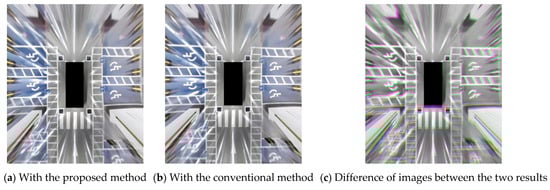 where is the grayscale value of the AVM image from the conventional method at the point, is the grayscale value of the AVM image from the proposed method, is the width of the AVM images, and is the height of the AVM images. The calculated RMSE of the two AVM images in Figure 17a,b is 0.0457 when the range of the grayscale is 0–1.