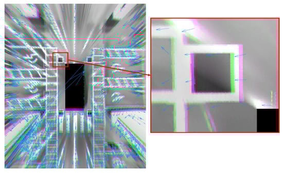Since the RMSE can depend on the content of the source images, we additionally compute optical flow to measure the displacement. We utilize a method of Farneback [37] to compute optical flow. Figure 18 shows the optical flow between the AVM images of the proposed method and the conventional method. The average of the optical flow is 7.1239 where the resolution of the AVM image is 1170 1000 . The RMSE value and the average of the optical flow indicate that the two AVM images are very similar.