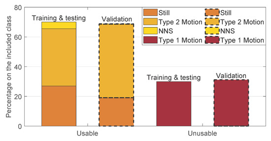 The segments of videos including events labeled as categories iii and iv in Table 2 were excluded in this work, since they would require different detectors, e.g., interventions detection or infant presence detection [25]. In particular, the included and excluded percentages in the entire dataset are, respectively, and . The majority of the excluded moments are caused by the babies being out of bed and by interventions, and , respectively. The breakdown of the included moments are shown in Figure 1 split between the training and testing, and the validation set. The segments containing type 1 motion events are considered unusable for the estimation of the RR, whereas, the ones containing type 2 motion, still, and NNS are considered usable. The cumulative percentages of type 2 motion, still, and NNS constitute and of the included moments for the training and testing, and the validation set, respectively. The remaining part contains the fragments annotated with type 1 motion. The occurrence of type 1 motion is, therefore, very similar between the two sets.