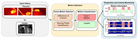 Multiple works proposed solutions to tackle the motion artifacts or random body movement problem in camera-based respiration detection [23,24]. However, not all random body movements hide the respiration information and by excluding all the segments containing motion from the respiration monitoring step, potentially usable segments are also excluded. In a recent study published by Villarroel et al. [25] motion robustness was achieved by combining an indicator of the quality of the reference signal with an indicator of the agreement between the RRs obtained using different sources. However, the detection of the respiration signals is dependent on skin visibility. Infants who are cared for in open beds in neonatal wards or in home-care environments are usually covered with blankets and wear clothing. A solution based on skin visibility, particularly of the chest/torso area, would, therefore, be impractical for these cases.