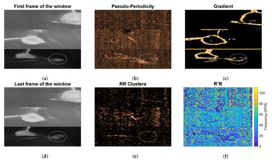Figure 3. Example of features obtained during a type 2 motion, i.e., arm motion. In (a,d) the merged thermal images are presented, the circle indicates the position of the baby’s arm where the type 2 motion is happening. The images in (b,c,e) show the three features. While in this case, pseudo-periodicity and gradient are sensitive to the presence of type 2 motion, Respiration Rate (RR) clusters are not, this is due to the matrix shown in (f) where the arm area can have frequencies equal to zero. - Respiration Rate Clusters (RR Clusters): this feature is based on the observation that respiration pixels are not isolated but grouped in clusters. To automatically identify the pixels of interest more accurately, modifications were introduced to this feature to improve the robustness to the presence of NNS, typical when the infant has the soother, and to cope with the presence of the respiration’s first harmonic. The frequencies corresponding to the local maxima of the spectrum were found and the properties of the harmonic were checked:is a vector, obtained for the pixel in position , containing the frequencies of the local maxima in the band of interest, which is identified by and respectively and Hz. The length of the vector is, therefore, variable and dependent on the spectrum content of each pixel , this operation was performed using the MATLAB function findpeaks. The harmonic properties were checked:is the spectrum of the pixels’ time domain signal calculated as but without applying the differential filter and is an element of .We have, therefore, estimated the main frequency component for each pixel. To avoid erroneous RR estimation caused by higher frequencies components, e.g., caused by NNS, the that were higher than were put to zero. Therefore:The are elements of , an example is shown in Figure 3f. The non-linear filter introduced in [26] was applied:where r and o identify the kernel cell, whereas m and l indicate the pixel. is a constant empirically chosen and equal to 70 as indicated in our previous work [26]. The resulting frame will map the pixels having similar frequencies around them.It should be noted that the on which we imposed the value 0 in Equation (10), will not result in a high , even if there are clusters of zeros in . This is due to the equation of the filter that with will produce NaNs (Not a Number). The same will happen for regions with type 2 motion, where the main frequency component is the DC. This property allowed to avoid type 2 motion regions in the pixel selection phase achieving motion robustness, an example is visible in Figure 3e.