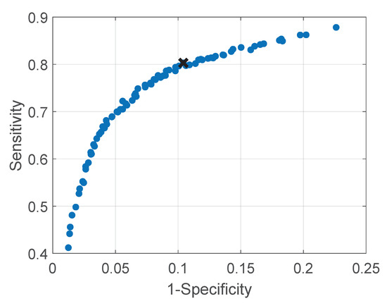 The average Receiver Operating Characteristics (ROC) curve for all nine folds obtained from the cross-validation applied on the training and testing set, is presented in Figure 4. The blue points represent the average sensitivity and specificity on all folds for that particular combination of and , whereas the cross is the average sensitivity and specificity on all folds corresponding to the most chosen parameter set. Table 3 shows the results of accuracy, balanced accuracy, sensitivity, and specificity using the final chosen set of parameters for the testing stage of the cross-validation and for the validation set that was not involved in the training.