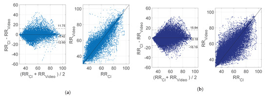 Bland-Altman and correlation plot: (a) training and testing set, (b) validation set. RRCI and RRVideo are in BPM.