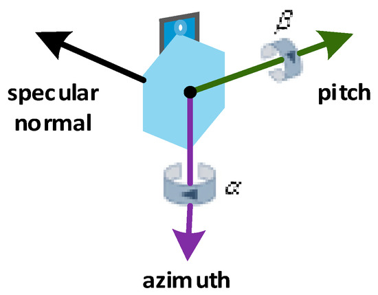 Assuming that the point light source is placed horizontally in the initial position, the pitch axis is orthogonal to the azimuth axis, and the central light axis of the reflector points to the north. This configuration is expressed as and in the northeast upper coordinate system and reflector coordinate system, respectively. At a certain moment, if the azimuth and altitude angles of the incident sunlight are and , respectively, the turntable rotates anticlockwise and clockwise around the pitch X-axis and azimuth axis, respectively. At this time, the central optical axis vector of the reflector coincides with the solar vector in the northeast upper coordinate system. In this case, in the local coordinate system, the transformation process from the optical axis vector of the mirror center to the coordinate rotation consistent with the solar vector can be expressed as