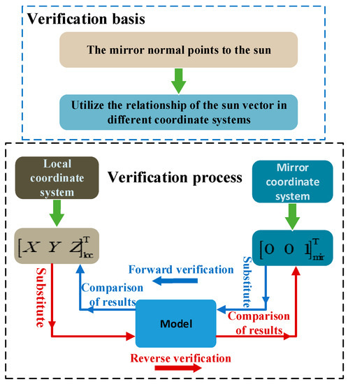 When the central light axis of the reflector points toward the sun, the coordinates of the solar vector in the mirror coordinate system are , and the unit vector coordinates in the local coordinate system are . First, forward verification is conducted according to Equation (3). By substituting and multiplying the three terms on the right side, we can obtain the vector representation of the sun in the local coordinate system, as follows: