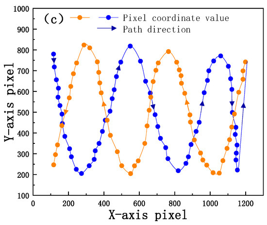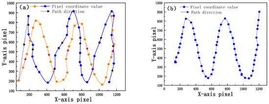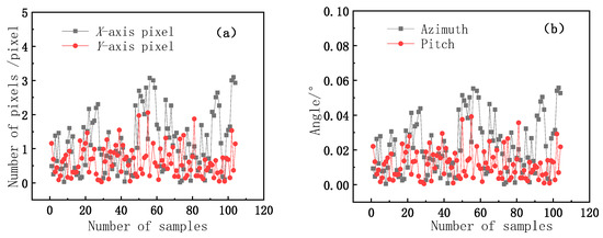 According to the two sets of data in Figure 9a,b, it can be determined by formula (21) that the RMSE values of the X- and Y-axis pixels are 2.0995 pixels and 0.8689 pixels, respectively, and the corresponding pixel angle resolution errors are 0.0377° and 0.0144°. The synthetic angular resolution error is calculated by formula (22) combined with the standard uncertainty formula [30], and the synthetic angular resolution error is 0.0403°.