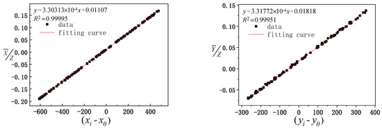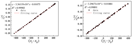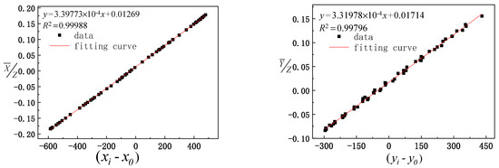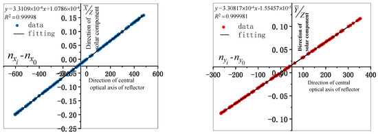 After the model is solved, it is necessary to evaluate the accuracy of the model parameters. First, the reliability of the results of the model is analyzed theoretically. The image centroid coordinates are used to represent the optical axis vector of the mirror as the X-axis, and the calculated solar vector value is considered the Y-axis in the fitting analysis. The linear fitting correlation coefficients of the two groups of values are considered to perform the reliability analysis of the evaluation model solution results. The fitting results of the two groups of data are shown in Figure 8.