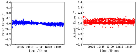 The error distribution data in Figure 9 show that the pixel error corresponds to the system model solution error, and the pixel average error and standard deviation in the X-axis direction are 1.253 pixels and 1.014 pixels, respectively. The average error and standard deviation in the Y-axis direction are 0.61 pixels and 0.45 pixels, respectively. The average error and standard deviation of the azimuth axis are 0.024° and 0.019°, respectively. The average error and standard deviation in the pitch axis direction are 0.012° and 0.0085°, respectively. According to the standard deviation data, these results are within the allowable error range. Therefore, from the theoretical error data, the reliability of the calculation model results is further verified.