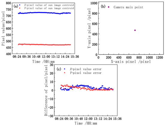 Through the inverse calibration model, the motor is driven and controlled, and the model is preliminarily verified. To further verify the accuracy of the model parameters, by considering the actual observation of the camera after calibration, the solar image is tracked and collected, and the centroid coordinates of the solar image are used for verification. The centroid coordinates of the solar image at different times are compared with the camera main point coordinates to reflect the deviation degree of the center light axis of the reflector pointing toward the sun. The root mean square error (RMSE) of the two groups of data is calculated by Equation (21) to quantitatively evaluate the correctness of the model solving parameters and the tracking control accuracy of the system.