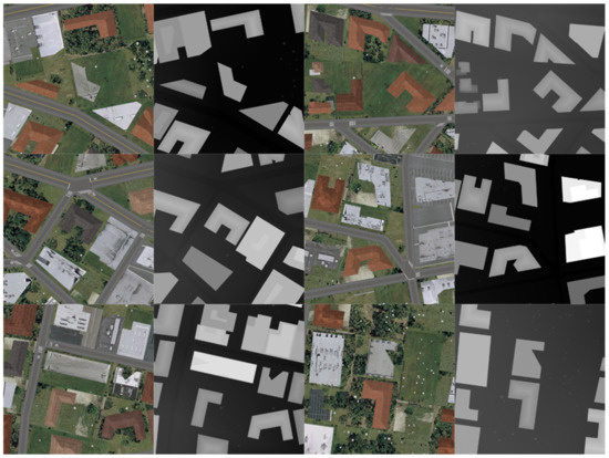 Synthetic dataset, similar to the one in [65], is generated automatically by modeling software and a game engine. Objects are randomly distributed in the virtual city, including roads, buildings, trees, lawns, etc. The 3D models are imported into the game engine through format, containing shapes, materials, and textures. The color maps and height maps are sampled and rendered at random positions, both in the format of . Some examples are given in Figure 3.