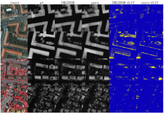 Our framework supports supervised learning by simply neglecting the style discriminant sub-network. In this learning mode, two datasets (Vaihingen and Potsdam) were trained separately as only one source data () is needed. was firstly inputted into style transferring sub-network to get a style distribution map T, and then, T was fed to the height regression sub-network to regress the height maps where the only was minimized to optimize both sub-networks jointly. As shown in Table 1, measurements of RMSE and ZNN were improved by 2% and 3%, respectively, compared to state-of-the-art work [60]. Visualized results are shown in Figure 4 and compared with IMG2DSM [29], where can be inferred that our result is sharper than that of IMG2DSM [29].