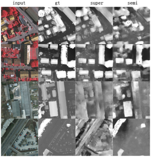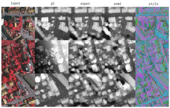 The inter-domain semi-supervised learning mode was also designed for the circumstance of lack of labeled images. In contrast to the inner-domain mode, this mode focuses on the problem of domain bias, in which the model trained in one city has difficulty being applied in another city, which is very common in practice. We used all the training data from one city with a small percentage of labeled data (20%) from another city as the supervised signals of height regression, and the remaining unlabeled data were used for unsupervised learning of style distribution. We used the same parameters as in the previous section to train and test the model and compared the results to the supervised learning method, fine-tuning [12], and with or without synthetic data, as shown in Table 3. The inter-domain configuration achieves the best result, as the unlabeled data contributed to constrain and unify the style distribution. Furthermore, the use of synthetic data enhanced the performance significantly. The visualized results are shown in Figure 6.