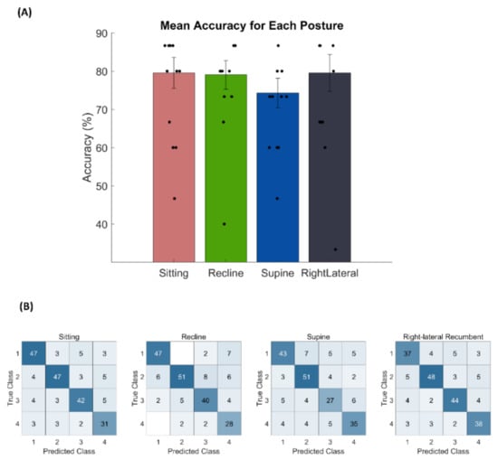 (A) The mean accuracy of online BCI control for each posture: sitting, recline, supine, and right lateral recumbent posture. The vertical black line denotes the standard error of the mean. The single dot represents the accuracy for each subject in each posture. (B) The confusion matrix for all subjects in each posture. It has 4-class for true and predicted class, which interprets as the number of selected targets for classifier and expected targets for each class, respectively. The blue color highlighted the number of targets.