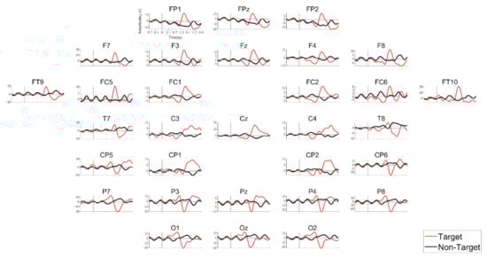 A brain–computer interface (BCI) enables people to communicate with the external world by conveying the translation of brain activity directly without passing through a normal output pathway involving the utilization of muscles for delivering a user’s commands or message [1]. For non-invasive BCIs based on scalp electroencephalography (EEG), commonly used types of features include a steady-state visual evoked potential (SSVEP), an event-related potential (ERP), and sensorimotor rhythms (SMRs). Among them, P300 is one of the ERP components appearing in a time range from 275 to 600 ms after stimulus onset, especially over central and parietal areas. P300 is induced in association with task-relevant and rare stimuli presented between a series of task-irrelevant and frequent stimuli [2]. A P300-based BCI does not require the learning of self-regulation of brain responses for those who are not familiar with the system [3] and has been one of the most popular forms of non-invasive BCIs [4,5,6] since Farwell and Donchi developed the P300 speller [7].