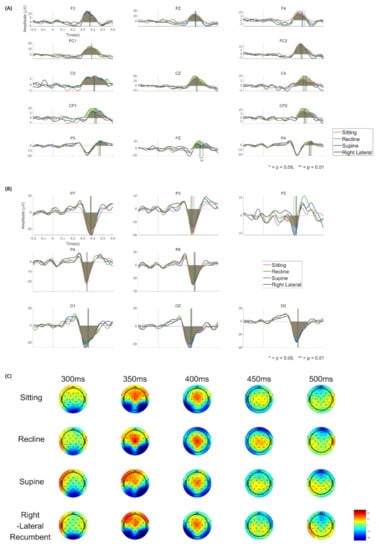 The grand averaged ERP graph for each posture. The red, green, blue, and black line indicates the ERPs for the sitting, recline, supine, and right lateral recumbent posture, respectively. The vertical lines denote the 50% area latency for each component. (A) The grand averaged ERP at electrodes where the P300 component appears. The shaded area represents the positive area of the ERP waveform between 300 to 550 ms after the stimulus onset. (B) The grand averaged ERP at electrodes where the N200 appears. The shaded area indicates the negative area of the ERP waveform between 200 to 450 ms after the stimulus onset. * p < 0.05, ** p < 0.01. (C) The topoplot for each posture in time 300, 350, 400, 450, and 500 ms. The color indicates the amplitude (μV).