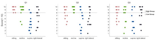 Scores for each question in each posture (sitting, recline, supine, and right lateral recumbent postures). The grey line shows a threshold for dividing the high-scoring group and the low-scoring group. Scores equal to or higher than the threshold were included in the high-scoring group.
