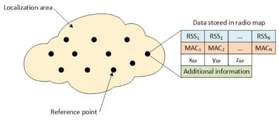 During the offline phase, measurements are traditionally performed at predefined reference points distributed in the area of interest, where localization services will be provided, also referred to as the localization area. The measurements on individual reference points are stored in the database widely called a radio map. The principle of the radio map is shown in Figure 1. The radio map consists of reference points identification, the position of each reference point, as well as measured data. The position of the reference point is defined by coordinates [xRP, yRP, zRP], where xRP and yRP represent coordinates in 2D cartesian space and zRP defines the floor of the building. The most important information in the radio map is represented by RSS samples measured from all available APs. All the RSS measurements are linked to MAC addresses of APs that transmitted the signal; these are used as identification of individual transmitters during the position estimation process.