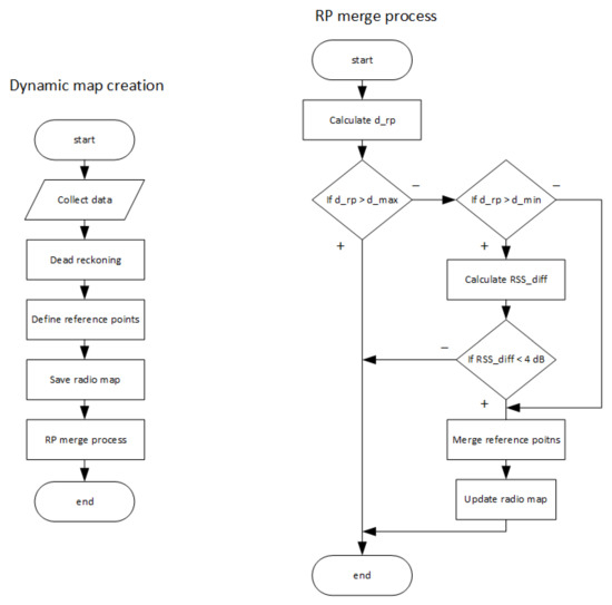 The last step of the proposed solution is the process of reference point merging. This process is used to combine measurements from the reference points with similar position or neighboring reference points with extremely similar RSS values. The flowchart of the dynamic map creation, as well as the Reference Point (RP) and merge process, is shown in Figure 3.