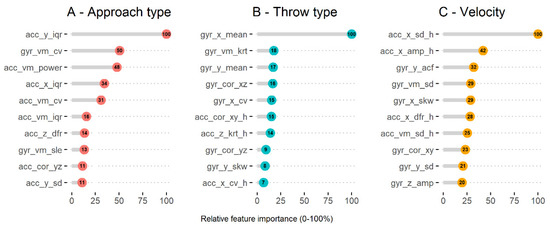 Relative signal feature importance for predicting approach type, throw type, and ball velocity. Models are as follows: (A) GBM with 3 s window and low-g range; (B) GBM with 3 s window and high-g range; (C) support vector machine with a polynomial kernel (SVM-P) with 2 s window and high-g range. The prefix indicates the accelerometer (acc) or gyroscope (gyr) sensor, the middle character is the axis (x, y, z, or vector magnitude), and the suffix indicates the feature: cv = coefficient of variation, skw = skewness, krt = kurtosis, dfr = dominant frequency, amp = peak-to-peak amplitude, ent = entropy. Features ending in “h” are obtained from the high-g accelerometer.