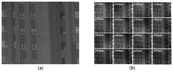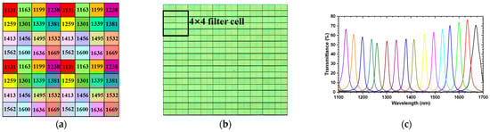 A PFA is composed of a large number of periodically repeated filter cells that are deposited on a substrate. The substrate can be optical glass or polymer film. Each filter cell is composed of multiple micro filters that are the same size as a pixel of the imaging sensor. Each micro filter only allows a narrow band light centered at a specific wavelength to pass through. In this paper, we selected a PFA containing 160 × 128 filter cells. Each filter cell was composed of 16 micro optical filters (4 × 4), 15 μm × 15 μm in size. In order to match the PFA, we chose a monochromatic sensor (GHOPTO; GH-SWGnet-15) with 640 × 512 pixels, 15 μm × 15 μm in size, to capture data. The PFA allowrf light of wavelengths centered at 1131, 1163, 1199, 1238, 1259, 1301, 1339, 1381, 1413, 1456, 1495, 1532, 1562, 1600, 1636, and 1669 nm with a bandwidth of 25 nm to pass through. Figure 1a shows the geometric pattern of the 16-channel PFA we selected, and the figure in each square represents the central wavelength of the light passing through the corresponding filter. Figure 1b,c shows the microscope image of the PFA and its measured response to light, respectively.