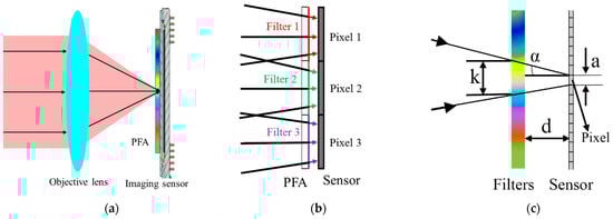 For the once-imaging scheme, the system was composed of an objective lens, a PFA, and an imaging sensor. As shown in Figure 2a, the PFA was placed in proximity to the imaging sensor, with the coated-side towards the pixels. When working, the incoming light beams from the object were imaged by the objective lens, spectrally mixed by the PFA, and finally captured by the imaging sensor. Figure 2b shows the corresponding relationship between the filters and pixels. This scheme possesses the advantage of a simple implementation and compact structure. However, there is an obvious flaw in the system. When assembling the PFA and imaging sensor, in order to protect the imaging sensor and the filters on the PFA to prolong the service life, the PFA could not be attached to the pixels, which means that there needed to be a gap between them. According to the gap between the protective glass and pixels of existing detector, this was about 0.5 mm. Because of the gap, severe crosstalk between different optical channels occurred. Figure 2c is a schematic diagram of the generation process of crosstalk, where is the diameter of the facula on the PFA projected by the light converging on a pixel of imaging sensor, is the diameter of a pixel, is the gap between the filters on the PFA and imaging sensor, and is the aperture angle of the objective lens in the image space. Based on the geometrical relation, we can get the following conclusion: