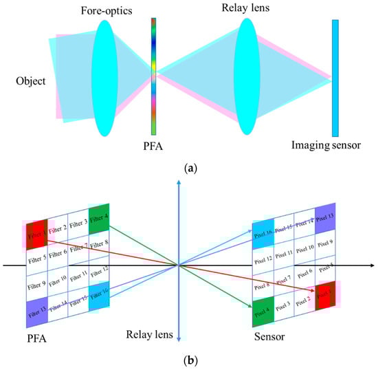 (a) Optical structure of re-imaging scheme and (b) one to one mapping correspondence between the filters on the PFA and pixels on imaging sensor.