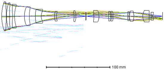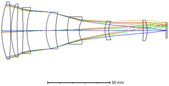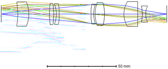 As the shape and size of the filters on the PFA were the same as the pixels of the imaging sensor selected, and there was a one-to-one mapping between them, the lateral magnification of the relay lens was required to be −1, and the optical distortion should be strictly controlled. Otherwise, the corresponding relationship would be disordered, resulting in crosstalk between the adjacent spectral channels of the PFA. To ensure that the magnification of the relay lens was strictly equal to −1 in each field, the system was optimized by the multi-configuration function of ZEMAX, and only the FOV was different among each configuration. We set 0.3 times, 0.5 times, 0.7 times, and full FOV in the different configurations, separately, during optimization. The image height of each configuration was set as the opposite of the object height of the corresponding field. The system was designed as a quasi-symmetric structure in order to reduce distortion. In order to combine it with the fore-optics and avoid the spectral shift of the filters on PFA, the relay lens was designed in the form of a telecentric path in the object space. The glass combination of H-ZF12, H-ZLAF68C, and H-ZPK1A was initially selected to reduce the chromatic aberration and secondary spectrum according to the theory in Section 3.2. We optimized the system using ZEMAX. The total axial length of the relay lens was about 120 mm. Figure 8 below shows the final optical layout of the relay lens.