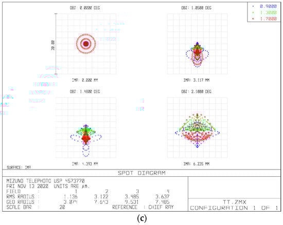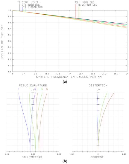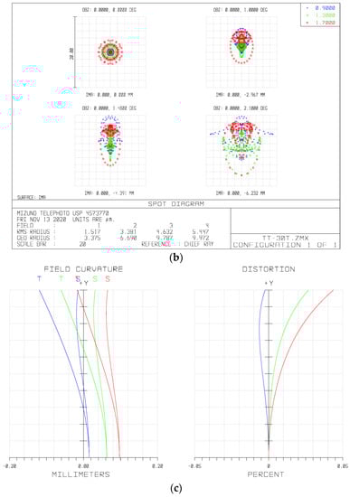 Optical distortion is the kind of aberration that deforms the image plane. By adjusting the shape and magnification factors of the lenses in this system, we restricted the optical distortion at a low level. As shown in Figure 6c (right), optical distortion of the system was controlled within a range of less than 0.05%. Furthermore, the maximum value of the field curvature was less than 0.1 mm. Overall, all aberrations of the fore-optics were well corrected.