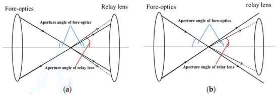 Aperture angle match diagram. (a) The aperture angle of the relay lens is greater than that of the fore-optics, and no vignetting will occur. (b) The aperture angle of the relay lens is less than that of the fore-optics, causing vignetting.