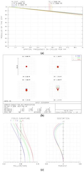 Optical performances of the fore-optics: (a) modulation transform function (MTF) of the system, (b) spot diagram, and (c) field curvatures and distortions of the different wavelengths.