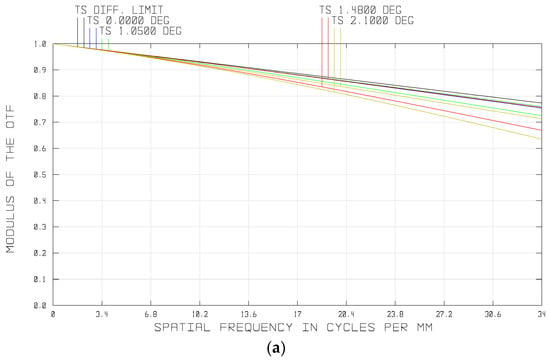 The modulation transform function (MTF) represents the image quality of the imaging system. The MTF curve of the fore-optics in the waveband of 900–1700 nm is shown in Figure 6a. It can be seen that the MTF at the full field of view (FOV) exceeded 0.70 at the Nyquist frequency of the PFA, i.e., 34 lp/mm, approaching the diffraction limitation. Figure 6b shows the spot diagram of the whole semi-FOV of the system, from which we can see that the maximum root mean square (RMS) diameter was less than one single pixel size (15 μm) over the full FOV.