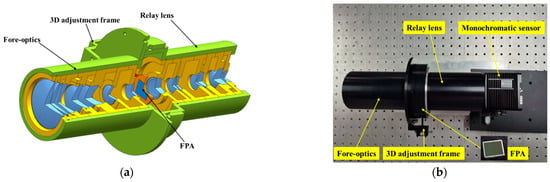 In order to further verify the feasibility of our imaging scheme and optical design, we built an experimental prototype. We first developed the mechanical configuration of the system to check for possible problems in the fabrication and integration. Figure 12a shows a perspective view of this mechanical configuration of the system. Based on the mechanical model, we built the experimental prototype. As shown in Figure 12b, the experimental prototype consisted of a fore-optics, a PFA, a relay lens, and a monochromatic sensor. Firstly, we tested the back-working distance of the fore-optics and the object distance of the relay lens we built. Based on the test results, we then assembled the two system together with a spacer between them. By replacing the spacers with different thicknesses, we adjusted the image plane of the fore-optics and the object plane of the relay lens to the same position, according to the pattern captured by the monochromatic sensor. Then, we placed the PFA on a three-dimensional adjustment frame, which was fixed on the lens tube, and placed it between the fore-optics and relay lens. In the stage of coarse alignment, a rough position of the PFA with respect to the fore-optics and the relay lens was determined according to the images captured by the monochromatic sensor.
