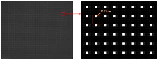 For the spectral calibration, we illuminated an integrating sphere with a monochromator, and configured our imaging spectrometer to view the integrating sphere’s exit port. The wavelength of the light from the monochromator was then adjusted to the center wavelengths of filters on the PFA (1131 nm, 1163 nm, 1199 nm, 1238 nm, 1259 nm, 1301 nm, 1339 nm, 1381 nm, 1413 nm, 1456 nm, 1495 nm, 1532 nm, 1562 nm, 1600 nm, 1636 nm, and 1669 nm) successively. After passing through the fore-optics and PFA, the monochromatic light incidents upon the imaging sensor through the relay lens. The monochromatic sensor eventually converted light energy into an electrical signal and formed a digital image, which was displayed on a computer to provide live feedback. By observing the image pattern on a computer, the optimized alignment of the PFA both in rotation and in the X–Y–Z dimension were accomplished by operating the three-dimensional adjustment frame. The optimized alignment ensured that each filter corresponded to a unique pixel and the relationship between them was an optical conjugation of the relay lens. Then, the center wavelength of each pixel was obtained. A view of a raw image of 1163 nm from the monochromator experiment is presented in Figure 13, illustrating the response of the system to monochromatic light. As expected, only pixels that corresponded to the filters with a central wavelength of light up, leaving the other pixels at a rather low intensity.